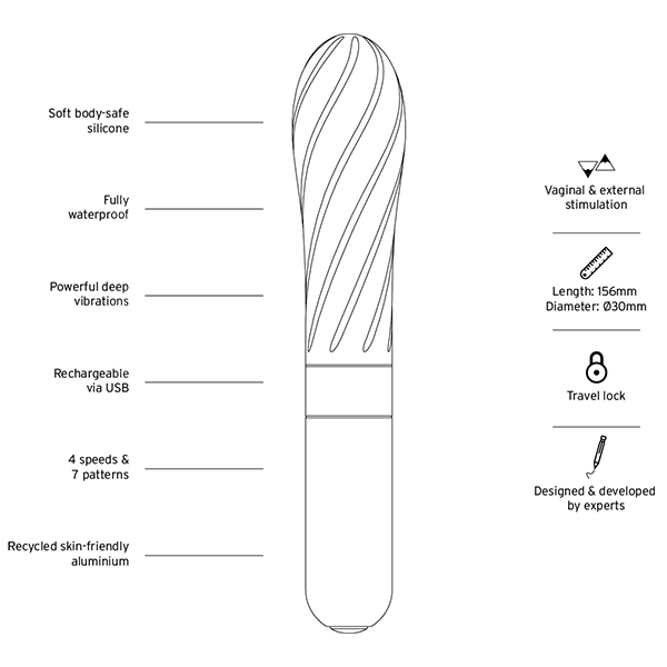 Love Not Warバレットシリーズは、美しいデザイン性とサステナブルであること、どちらも兼ね備えた素材「リサイクルアルミニウム」をベースに作られています。挿入し、お肌に直接当てる先端部分は、ふんわりとソフトな心地よいシリコン。表面がベタつかず、なめらかですべすべしています。撫でるように繊細な振動から、お腹の中心に向かって響きわたるパワフルな振動、さらに、リズミカルな脈動まで、全10種類のバラエティに富んだ振動パターンを選べます。トラベルロック機能で持ち運びに便利。ボタン一つでシンプルな操作。30分以内であれば1mまで浸水可能な完全防水仕様なので、万が一浴槽に落としてしまっても安心。●素材:シリコン、リサイクルアルミニウム、リサイクルABS樹脂、バイオプラスチック●充電方法:USB●充電時間:フル充電2時間●連続使用可能時間:最大1時間●振動パターン:10(振動強弱4段階+リズムパターン6種)●防水:完全防水(IP67)※こちらの商品は受注発注商品の為、ご注文から発送までに3、4営業日掛かる場合が御座います。