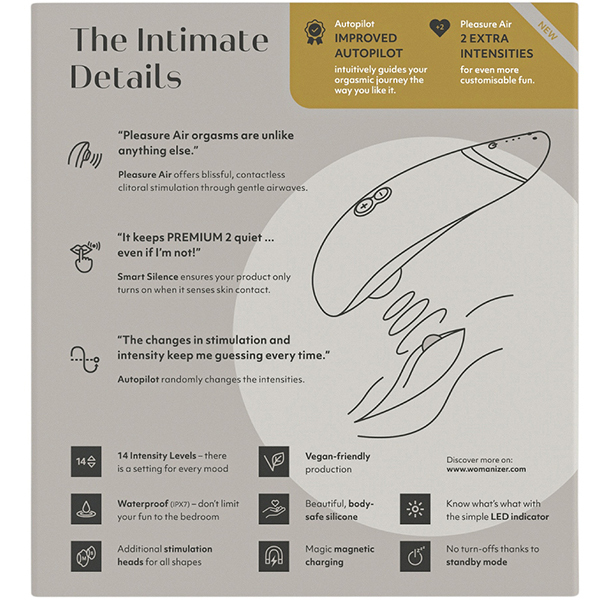 ボタンを押さなくてもお肌に触れるだけで吸引できるタッチセンサーを搭載!あのウーマナイザープレミアムがバージョンアップした「ウーマナイザー プレミアム2 (グレー)」。吸引強弱機能は12から14段階へパワーアップ!パイロットモードを搭載することで、ボタンの操作をしなくてもウーマナイザーが吸引の強弱を自動でコントロールしてくれます。振動は弱・中・強の3段階!予測できない楽しみを味わいたいという人はもちろん、カップルさんで使うときにもこれらの機能は大活躍♪ボタン操作に慣れていない方でも感覚的にお楽しみ頂けます。素材はシリコン/ABS樹脂で2時間のフル充電で連続4時間の使用が可能です。※製造時期によりパッケージが異なる場合がございます。※こちらの商品は受注発注商品の為、ご注文から発送までに3、4営業日掛かる場合が御座います。