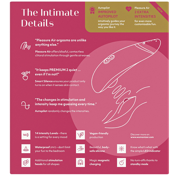 圧倒的な人気を誇るウーマナイザープレミアムが2へバージョンアップした「ウーマナイザー プレミアム2 (ラズベリー)」!強弱12段階から14段階へパワーアップし、従来の吸引バイブに新たに「タッチセンサー機能」と「パイロットコントロール機能」を搭載。タッチセンサー機能では煩わしいボタン操作は必要なく、シリーズの中でも圧倒的に使いやすくなりました♪お肌に近づけると自動で吸引し、離すと自動でストップ!これならボタン操作に不慣れな人でも安心♪さらに予測できない楽しみを味わいたいという方のために弱・中・強3段階のパイロットモードを搭載。ボタン操作をしなくてもウーマナイザーが自動で吸引の強弱をコントロールしてくれるので体感をじっくり味わいたいときに最適です!素材はシリコン/ABS樹脂で2時間のフル充電で連続4時間の使用が可能です。※製造時期によりパッケージが異なる場合がございます。※こちらの商品は受注発注商品の為、ご注文から発送までに3、4営業日掛かる場合が御座います。