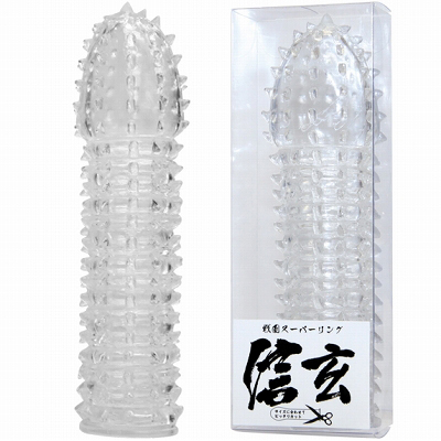 戦国武将の名に相応しい、夜の頼もしい味方が登場!フルカバータイプの男性用補助グッズ「戦国スーパーリング 信玄」は、クリアカラーのボディ全体にトゲトゲがびっしりと生えたデザイン。装着すれば武将の様に責めまくるトゲで、パートナーを刺激!もちろん早漏防止効果もアリ!サイズはハサミ等でカットし、調節もできます。
