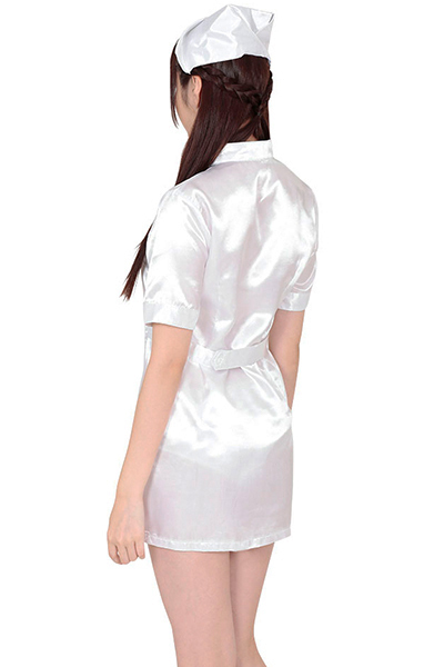 男女問わず、誰もが一度は憧れるナース服コスチューム(L)。キラキラとした純白生地の光沢感がとってもキレイ!セクシーなミニスカートのワンピースとナースキャップのコスプレセットです。フロントはボタン式で下まで開きます。※Mサイズ(b15245)、LLサイズ(b18128)あります。