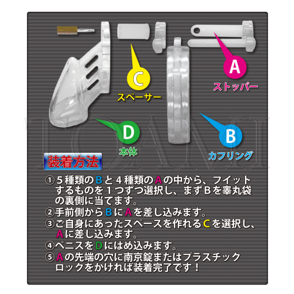 さらに拘束感を味わいたい方に!人気のプラスティック貞操帯「CB-6000」にショートバージョンが登場!「CB-6000」よりも局部の全長が約2cm短くなり、さらに強い拘束感を味わえるようになりました。大きさの異なるカフリングとピンが付属していますので、フィット感の調節も可能です!また装着したまま排泄もできるので、装着後に付属の南京錠、またはプラスティックロックで鍵をかければ、日常的に拘束&勃起制限を行えます。こちらはSMボンテージ風のブラックカラー。