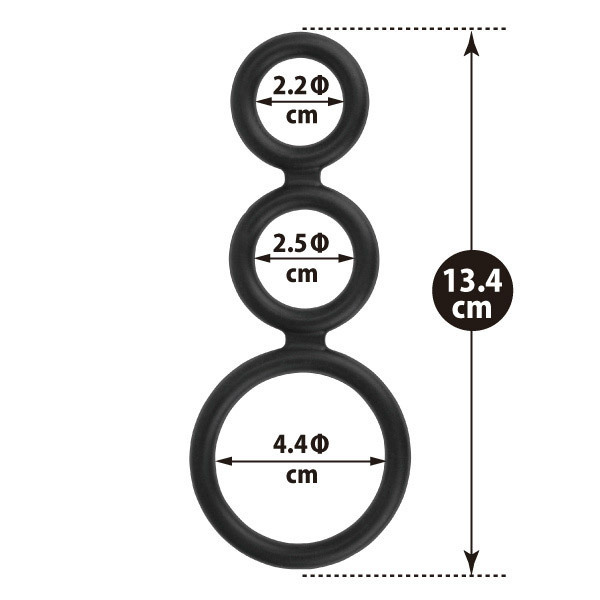 大中小のリング側面を連結!屏風折りにすることで平面から立体形になる黒いコックリング。いつもよりギンギンになったペニスで長時間プレイ!玉袋の裏を通してペニスの根元から勃起をサポートできる、シンプルな3連コックリングです。シリコンの締め付けは少しキツめの仕上がり!連結部分をカットして個別に使用する事もできます。