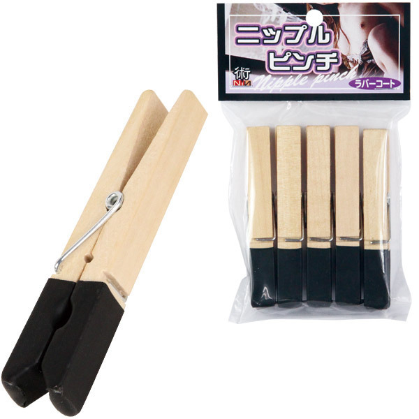 シンプルな木製デザイン!挟むだけで乳首に刺激と快感が与えられるニップルクリップ(5個入り)です。乳首を挟む部分を柔らかなゴムでカバーしているので安全安心!お肌を傷つける心配がない上に、痛すぎない心地よい刺激がクセになりますよ。一袋に5個も入っているので、敏感な部分を何箇所も挟んで楽しむのもアリ。SMプレイを盛り上げるアイテムのひとつです。