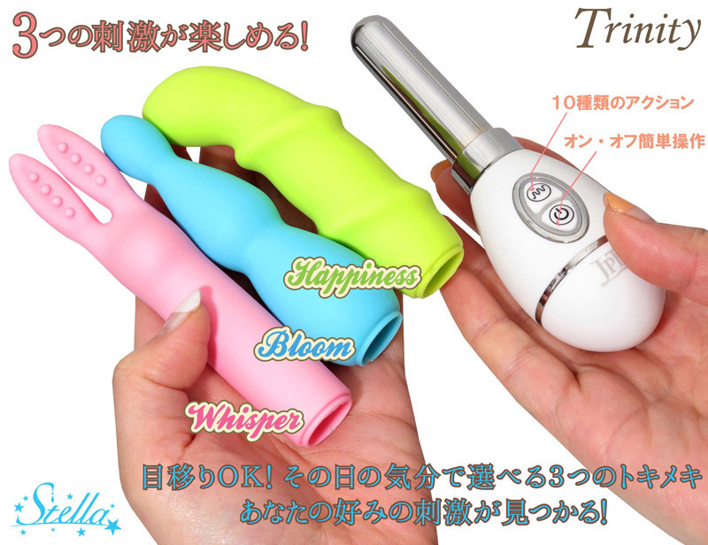 可愛いパステルカラー!特徴的な形状のアタッチメントキャップを交換して使えるスティックローター。10種類の多彩な振動とボタンを押すだけの操作性がGOOD!手に馴染みやすい卵型グリップを採用した技ありローターです。3つのキャップは、クリや乳首を挟んで刺激できるイボ付き耳のピンク、丸い先端と2つのくびれがほどよく括約筋を刺激するブルー、Gスポットに届きやすいカーブと螺旋のグリーン!もちろん、これらを被せなくても遊べます。