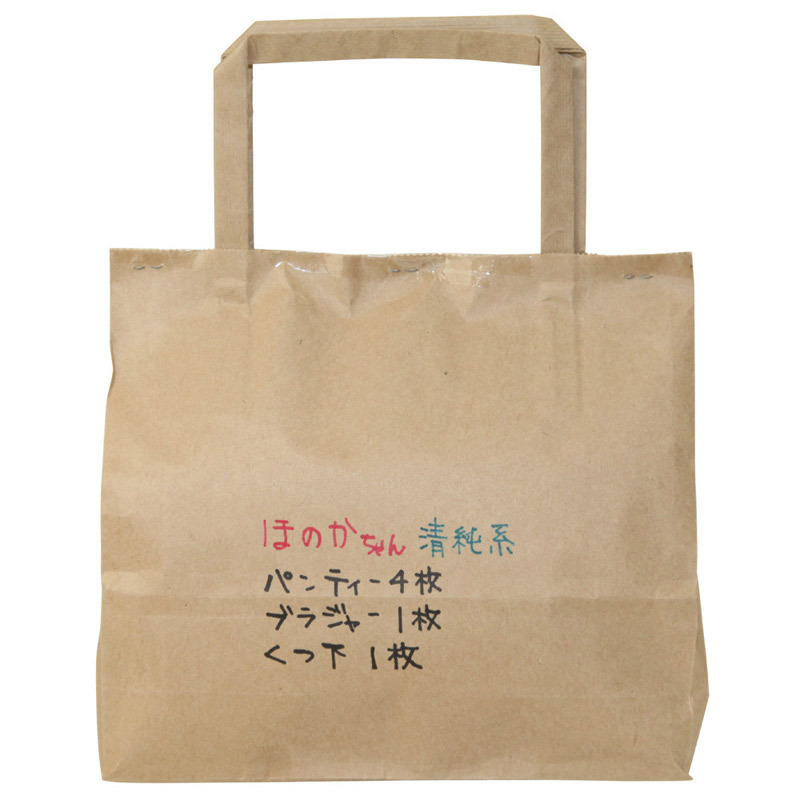 五感フル稼働でどうぞ♪オナニーに役立つフェティッシュグッズ。●女子校生の脱ぎたて下着セット●紙袋にリアルな女性の名前付き●パンティ×4・ブラ×1・靴下×1●色や柄は開けるまでのお楽しみ。匂いフェチ歓喜!たった今脱いだかのような生々しさも感じられるリアルなランジェリー&小物セット。思わず着ちゃうもよし、クンクンスリスリしてもよし、ご自由にお楽しみください。※アソートとなりますので、色・柄・種類のご指定はできません※予告なく写真パッケージが変更となる場合がございます※USED加工を施した新品未使用品です