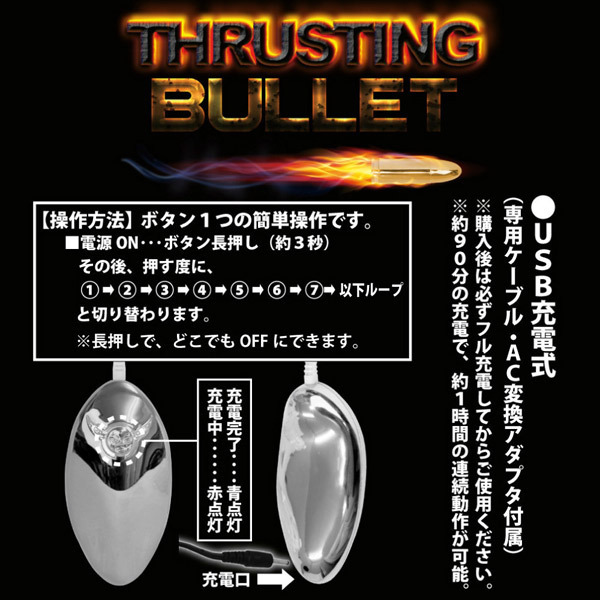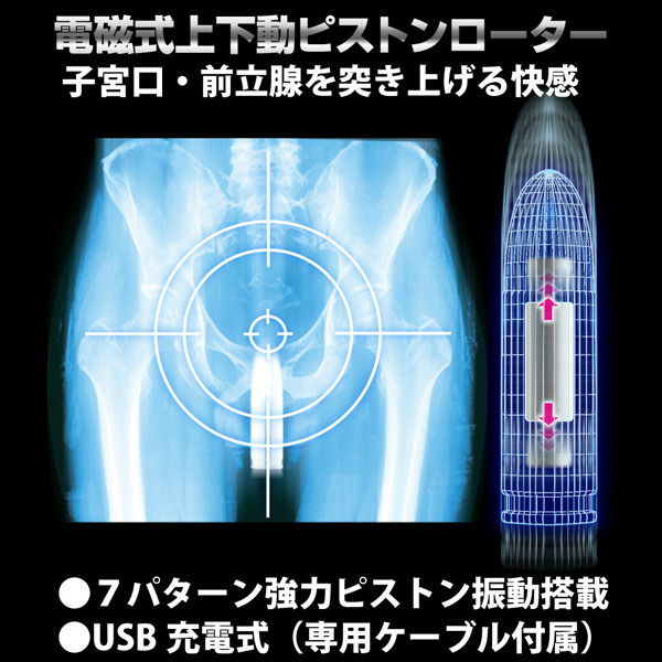 ナカまで響くズンズン刺激!パワフルに上下運動する斬新ローター。●弾丸フォルムのシングルタイプ●メタリックなきらめきボディ●電磁石による反発力でピストン●ワンボタンの簡単アクション●電源…ON/OFFともに3秒長押し●振動…押すごとに7種切替(ループ)●専用ケーブルによるUSB充電式●フル充電(90分)で約1時間稼働●充電完了は一目瞭然(赤→青)。握りやすいマウス型リモコンに銃弾のような先細り形状で攻撃的プレイを堪能!意志を持つようにググッと突き上げ運動をするパワフルローター。ヴァギナだけでなくアナルでも楽しめるマルチタイプです。※初回は必ずフル充電してからご使用ください。