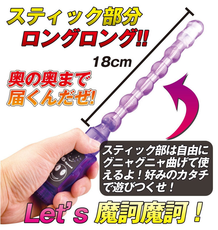 アナルの奥までブルブル刺激!芯がクネクネ曲がっちゃう6連ボールのスティックローター。●挿入部分18cm・前立腺にも楽々届くロングサイズ●スリムな先端に超小型パワフルモーターを搭載●ボタン送りで簡単に選択できる6つのバイブレーション●現在の振動をライトでお知らせ●単4電池3本使用。中身スケスケのクリアボディ!U字やS字へと自在に変形する姿が面白い、実用的なローターです。
