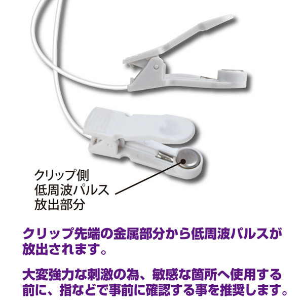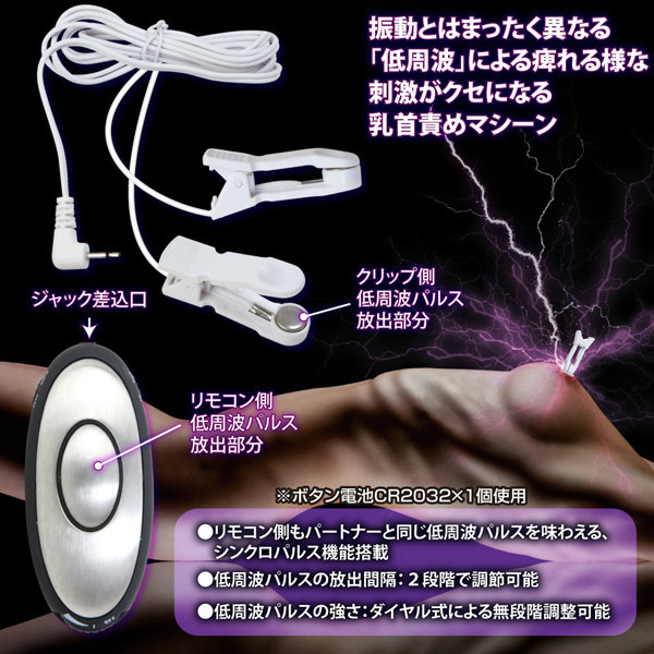 ただの振動では物足りない方へ!クリップ刺激と脈打つパルス刺激でダブル責め出来る乳首ローター。●超刺激的な低周波パルスローター●乳首責め用の「サンダーパルス1」●ジャック式ニップルピンチ2個付●ダイヤル式で簡単にコントロール●低周波パルスの強弱は無段階調整●放出速度間隔は2段階の切り替え可●リモコン側にもパルス機能を搭載。オナニーやSMプレイにも最適♪ビクンビクンと脈打つ低周波パルスの強烈刺激を味わえるエレクトログッズ「サンダーパルス1・ニップルピンチ」。リモコン側にもパルスが発生するシンクロパルス機能を搭載し、パートナーと快感を共有することも可能!乳首をいじめ抜く癖になるような強い快感刺激は、チクニー上級者の方にもお勧めです。※非常に強力な刺激の為、ご使用の際はOFFの状態から徐々に強めて調節してください。