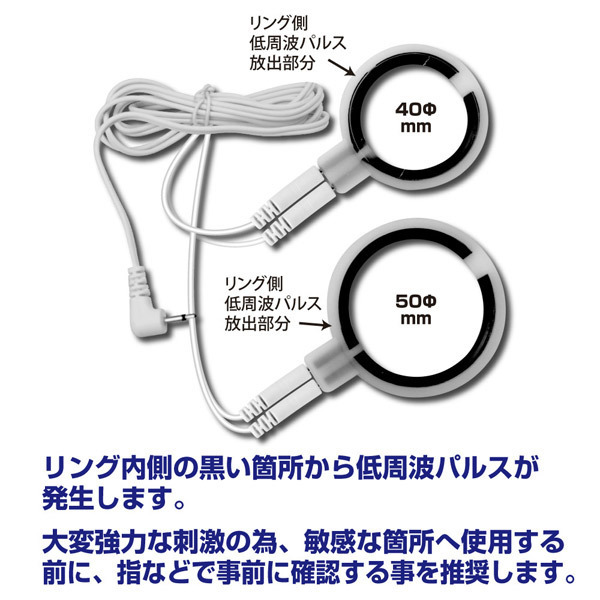 ただの振動では物足りない方へ!バイブとは異なる脈打つようなパルス刺激を味わえる大小のコックリング型ローター。●超刺激的な低周波パルスローター●Wリング型の「サンダーパルス4」●大小ペニスリング各1個ずつ付属●リング内径:大5φcm、小4φcm●取り外せるジャック差し込み式●ダイヤル式で簡単にコントロール●低周波パルスの強弱は無段階調整●放出速度間隔は2段階の切り替え可●リモコン側にもパルス機能を搭載。オナニーからSMプレイまで♪ビクンビクンと脈打つ低周波パルスの強烈刺激を味わえるエレクトログッズ「サンダーパルス4・ダブルコックリング」。リモコン側にもパルスが発生するシンクロパルス機能を搭載し、パートナーと快感を共有することも可能!より強い刺激を求める亀頭オナニー上級者の方にもお勧めです。※非常に強力な刺激の為、ご使用の際はOFFの状態から徐々に強めて調節してください。