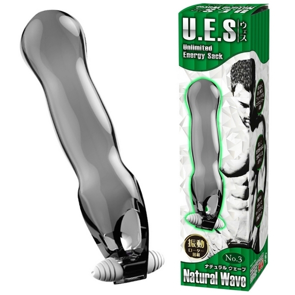 Wホールドでサイズアップ&ロングプレイ!極厚スキンの電動ペニスサック「UES(ウエス)3 ナチュラルウェーブ」。●オールカバーの電動サック●滑らかフォルムの「No.3」●全長18.0cm、亀頭部4.3φcm●ウェーブ形状の黒光りボディ●極厚仕様のエラストマー素材●伸縮素材でしっかりフィット●根元を締め付ける玉袋用の穴●玉袋裏側にミニローター付属。玉袋への振動でさらに射精感UP!極厚スキンで竿全体+玉袋をガッツリ締め付けて持久力を高めながら、振動快感も得られる男性補助グッズ。付属のローターは取り外し可能ですが、電池交換不可の使い切りタイプです。