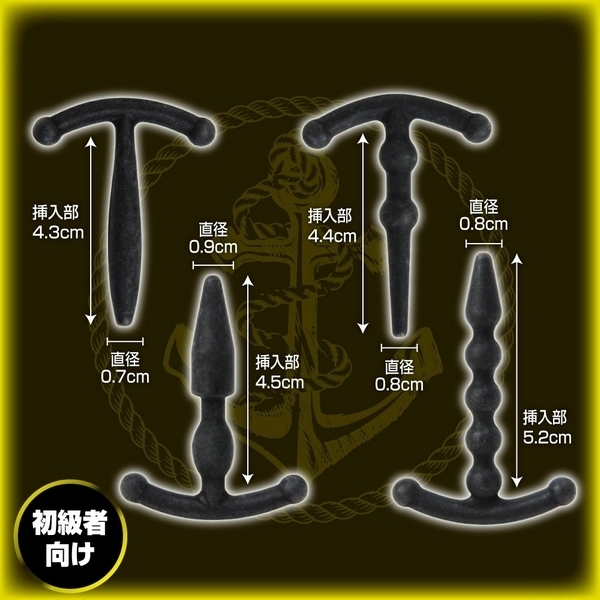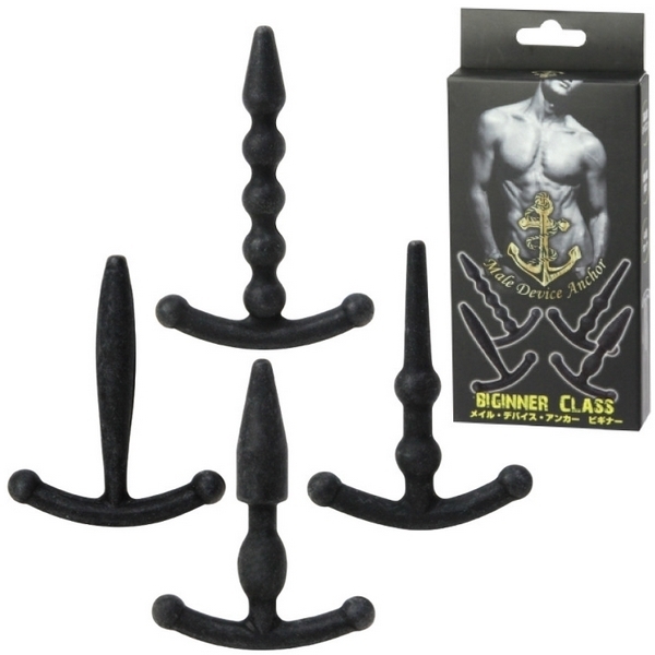 CBTビギナーさんの尿道責めプレイに♪錨デザインの尿道プラグ4個セット「メイルデバイスアンカー ビギナー」。●マニア向けの尿道プラグ×4個セット●柔軟性のある高品質シリコンを採用●初心者さんにも安心のショートサイズ●タイプ1:挿入部長4.3cm×直径0.7cm●中腹部が緩やかに膨らんだカーブ形状●タイプ2:挿入部長4.5cm×直径0.9cm●拡張に適した矢尻フォルム+ボール形状●タイプ3:挿入部長4.4cm×直径0.8cm●挿入しやすい先細ヘッドと2連ボール形状●タイプ4:挿入部長5.2cm×直径0.8cm●小さめの矢尻ヘッドと4連ボール形状。究極の快感テクニック、尿道責めで新たな快楽を!フェティッシュなCBTプレイ用のSMグッズ。刺激の高さと負担の少なさを両立させたスリムボディの「ビギナー」タイプは、尿道責めプレイ初級者さんの入門用に最適です。