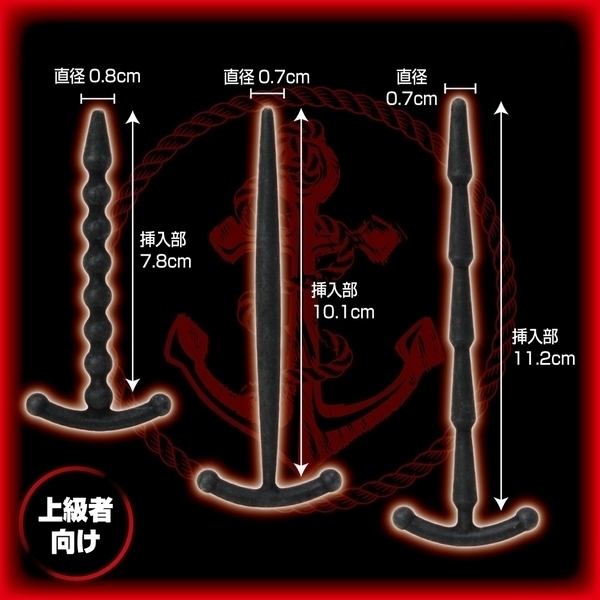 CBT上級者さんの尿道責めプレイに♪錨デザインの尿道プラグ3個セット「メイルデバイスアンカー アドバンス」。●マニア向けの尿道プラグ×3個セット●柔軟性のある高品質シリコンを採用●奥まで届く上級者向けのロングサイズ●タイプ1:挿入部長7.8cm×直径0.8cm●先端から根元まで続く7連ボール形状●タイプ2:挿入部長10.1cm×直径0.7cm●中腹部が緩やかに膨らんだカーブ形状●タイプ3:挿入部長11.2cm×直径0.7cm●引き抜き時が刺激的な5連の円錐形状。究極の快感テクニック、尿道責めで新たな快楽を!フェティッシュなCBTプレイ用のSMグッズ。刺激の高さと負担の少なさを両立させたロングボディの「アドバンス」タイプは、奥深くまで刺激が欲しい上級者さんに最適です。