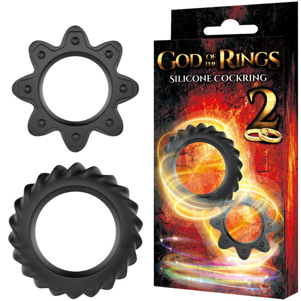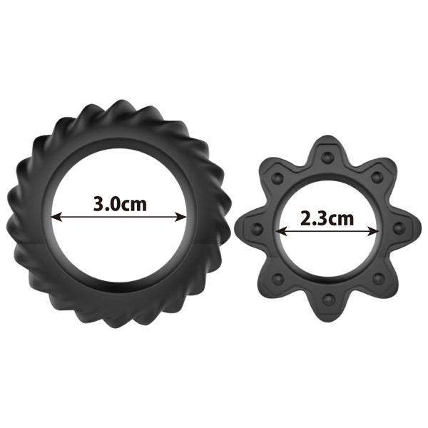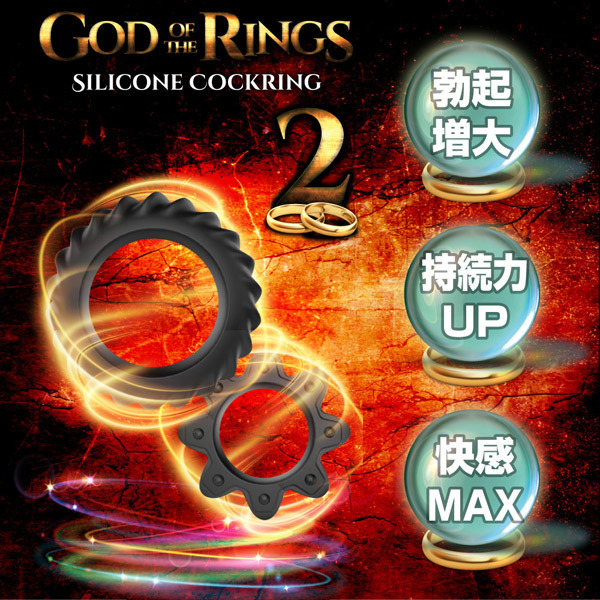 勃起増大、持久力UP、快感MAX!高品質シリコン製コックリング2種セット「ゴッドオブザリング 2」。歯車のようなギア型フォルムの小リングは内径2.0cm、タイヤのようなねじ歯車型の大リングは内径3.4cm。男性自身をしっかり締め付けて強力サポートするペニスリング2種セット!2個同時に装着すれば神の如きパワーがその竿に宿るかも。