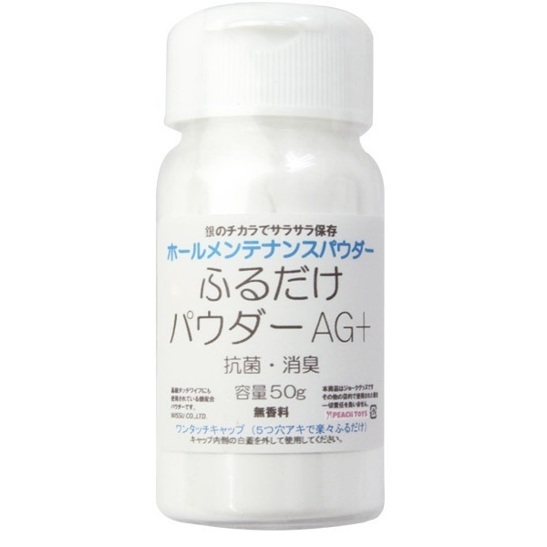 銀のチカラでサラサラ保存♪無香料のオナホール専用メンテナンスパウダー「ふるだけパウダーAG+ 50g」。●5つ穴開きのワンタッチキャップ●抗菌・消臭に優れた銀イオン配合。お気に入りを長く愛用♪オナホのメンテンスに必須の専用パウダー。洗浄後の乾燥させたホールにパウダーをまぶし擦り込むだけ!コーティングしてから保管することで劣化を抑制、さらにAG配合で抗菌効果も期待できます。指で直接馴染ませても問題ありません。
