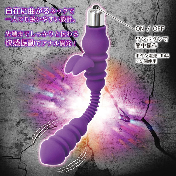 奥の奥まで響いて貫く衝撃快感!フレキシブルボディのアナルグッズ「激槍(げきそう)ランサー」。高品質シリコンを採用した凸凹のリング状ボディがアナルをほぐしながら奥まで届きます。さらに、先端までしっかりと伝わる強力バイブレーションが前立腺を直撃!自在に曲がるフレキシブルネックと、ワンボタンの簡単操作で一人でも扱いやすい設計です。ボタン電池LR44×5個付属。