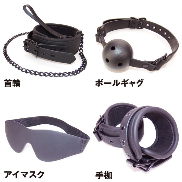 パッケージ:26.0×35.9×6.0cm セット内容:首輪、ボールギャグ、アイマスク、足枷、パドル、ムチ、手枷