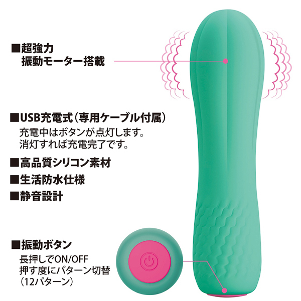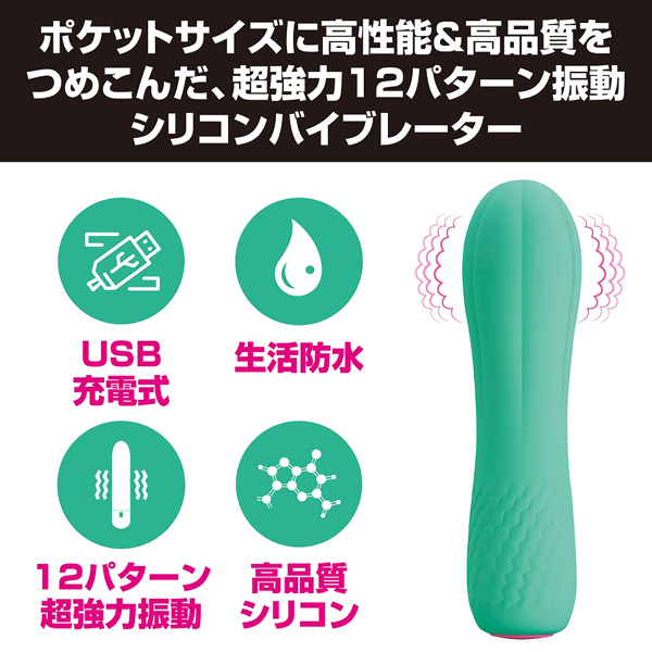 マットな質感の高品質シリコン素材を採用した、携帯サイズのUSB充電式シリコンバイブレーター。サボテンのような見た目が特徴的なコチラは全長11.6cm、太さ3.1cmの小型タイプながら、なんと12種もの振動パターンと一気に絶頂へと導く強力振動を搭載!出先でも気持ち良くなりたいなんて時には、鞄や車からサッと取り出して楽しめるのもこのコンパクトなシリコンバイブレーターの持ち味。クリや乳首への押し当て刺激や、挿入してのGスポット責めなどにも最適ですよ♪生活防水搭載、専用コードが付属しています。