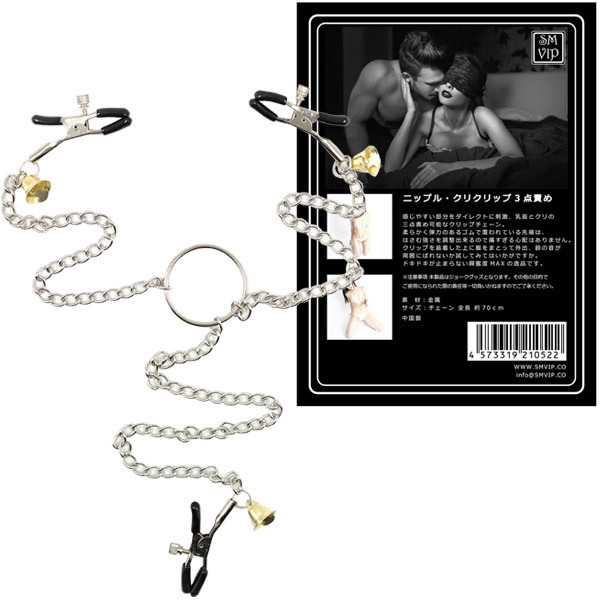 感じやすい部分をダイレクトに刺激!SMグッズで人気のブランドSMVIPから3点責めが出来るSMグッズが新登場。こちらは両乳首とクリの3点を同時にクリップで挟み込んで刺激を与えるグッズで、SMチックなイタ気持ちよさでM心を高めてくれるでしょう♪チェーン長は70cmあるので女性の身体ならば両乳首とクリの3点責めにジャストなサイズと言えるでしょう!それぞれ先端にはワニ口のクリップが付いており、ゴム製のカバーで覆われているため跡が残りづらく、挟む強弱も調整出来ます。また、クリップには鈴がついているので、鈴の音が周囲にばれないか試してみてはいかがでしょうか!