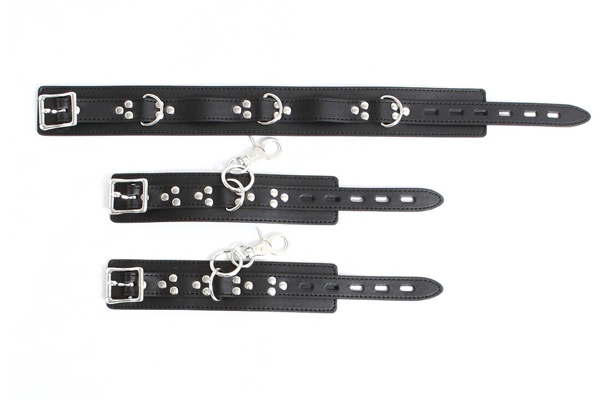 パッケージ:55.0×12.0×5.5cm 本体:首輪(55.5×5.0cm・ベルト穴5個)・手枷(33.5×5.0cm・ベルト穴5個) セット内容:首輪×1本、手枷×2本 素材:合皮、金具