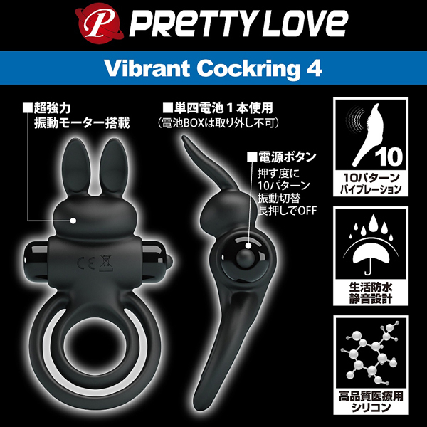 大小2つのリングで締め付け男の夜をロングサポート!振動機能付きシリコン製ペニスリング。メディカルグレードシリコンの柔らかリングが根元からギュッと締め付け!敏感なムスコの持続力UPとともに、超強力モーターを搭載したウサギ型のヘッドが10パターンの振動でパートナーを刺激する♪生活防水&静音設計、電池式(単4電池×1本使用)