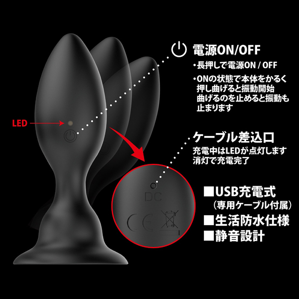 誰にも知られずこっそり楽しむ高性能モーター搭載のUSB充電式アナルプラグ。お尻に挿入して身体を少し傾けるだけで中で本体が曲がり振動がON、強力振動が身体の奥まで響きわたる♪座ったままでも立った状態でも、誰にも知られず密やかに快感振動が楽しめる医療用シリコン採用のアナルプラグ。生活防水&静音設計、専用ケーブル付属
