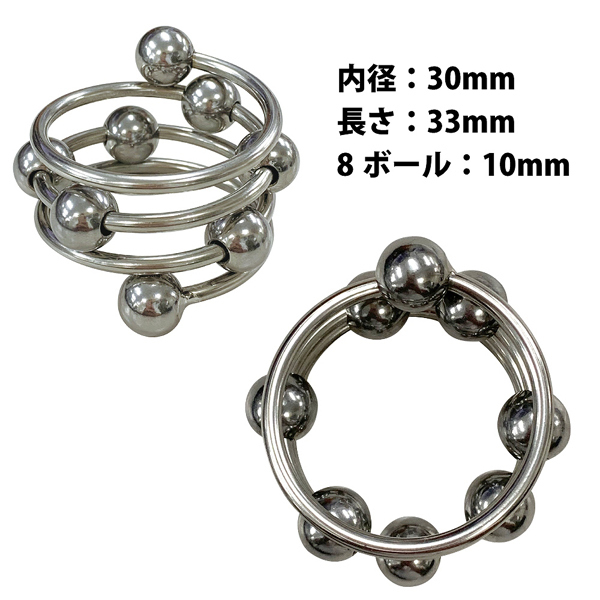 男性機能を高めながら格好良くお洒落に飾る内径3cmのメタル製男性補助リング。可動式の8つの金属ボール付きで、複数使いでさらに刺激がパワーアップ!螺旋状にデザインされたスタイリッシュな見た目に気分も上がります♪長さ3.3cm、ボールサイズ1cm