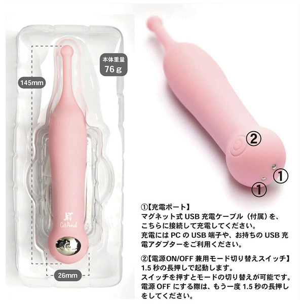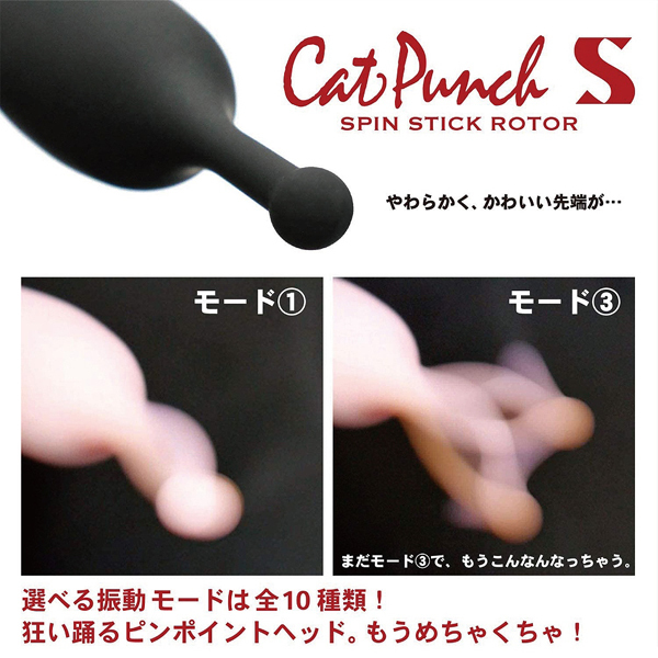 触覚が高速で狂い踊る!高周波&高速旋回でスピン振動するUSB充電式スティックローター「キャットパンチ」。球体のついたピンポイントヘッドが敏感部位を刺激!強く押し当てるようにすれば旋回するヘッドが小刻みに叩く♪振動パターンは全部で10種類、メンテナンスしやすい生活防水仕様!1つのボタンで簡単操作できるUSB充電式ローター。充電ケーブル付属、ブラックカラー