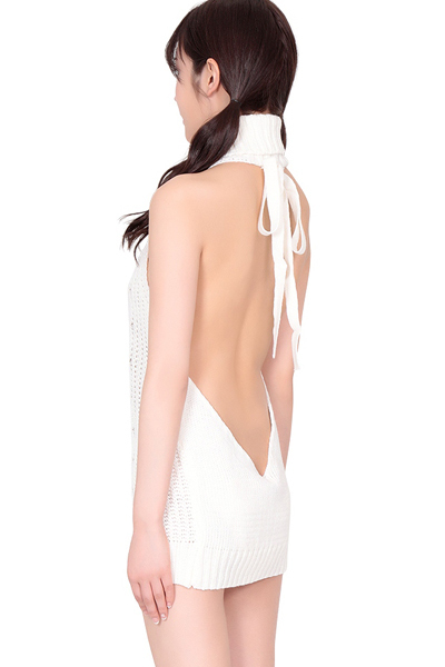 SNSで人気の悩殺ニットが登場!首の後ろがリボン結びになったケーブル編みの可愛いニットワンピ(ホワイト)。胸横から背中までがっつり露出させた大胆ニットセーターで可愛く誘惑♪特別な日の一着にぜひどうぞ!