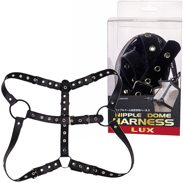 回転刺激を楽しめる乳首責めグッズ「ニップルドームR(b29020)」を乳房で密着固定しハンズフリーで楽しむことのできる専用ハーネス「ラックス」。柔らかな合皮素材の黒ハーネスがニップルドームを胸にしっかり固定!サイズ調整できるピンバックル式で、男女、体型問わず幅広いプレイを可能にします。