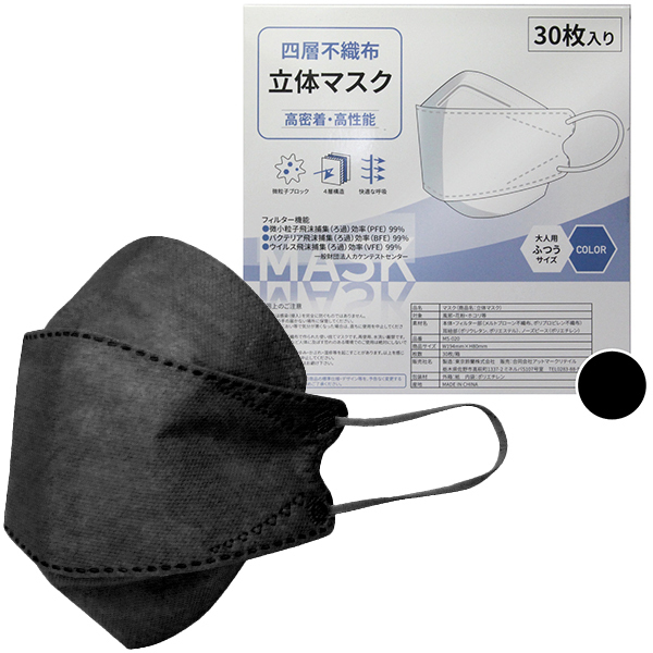 風邪・花粉・ウイルス対策に。大人用で普通サイズの四層不織布立体マスク(ブラック)です!30枚入りの高性能四層不織布立体マスク。フィルター機能は微小粒子飛沫捕集率(ろ過)効果(PFE)99%。バクテリア飛沫捕集(ろ過)効果(BFE)99%。ウイルス飛沫捕集(ろ過)効果(VFE)99%。立体構造でマスク内部にスペースが出来るため快適にすごせます。