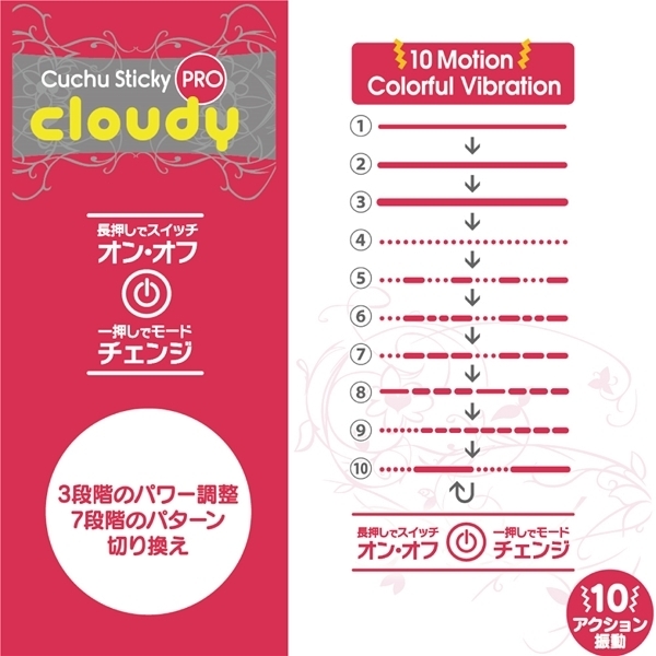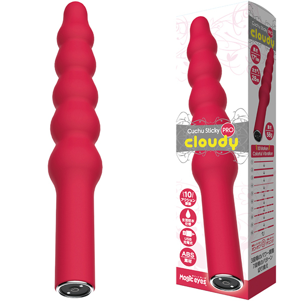 電源はUSB充電式で、ポコポコとした雲のような形状だから入り口から奥までの刺激をしっかりと楽しめるスティックローターです。10モードもの振動パターンがあるので、その中から自分の好みを選ぶことが出来、生活防水設計となっているのでメンテナンス製にも優れています♪マグネット式の充電用USBケーブルが付属しているのでご家庭の環境で充電可能!操作方法も簡単で電源スイッチの長押しでオン・オフのみというシンプルさ♪クリムゾンマットコーティングのボディは長さ171mmと十分なサイズ、太さは最大28mmで細い部分から徐々に太くなるのでどなたにでも使用して頂けます。