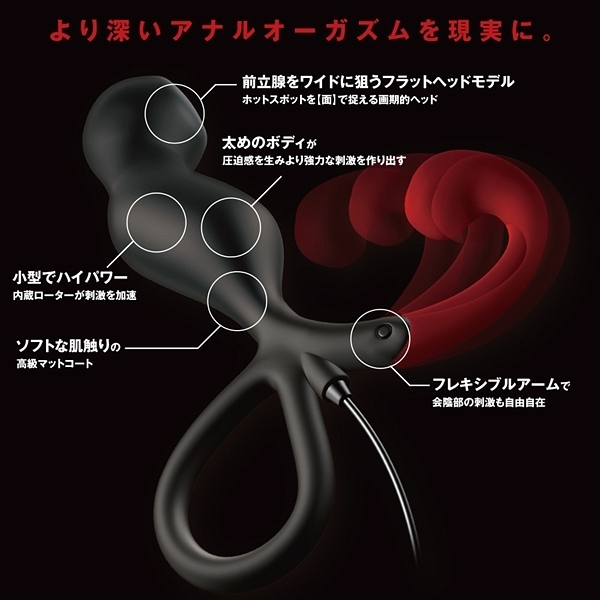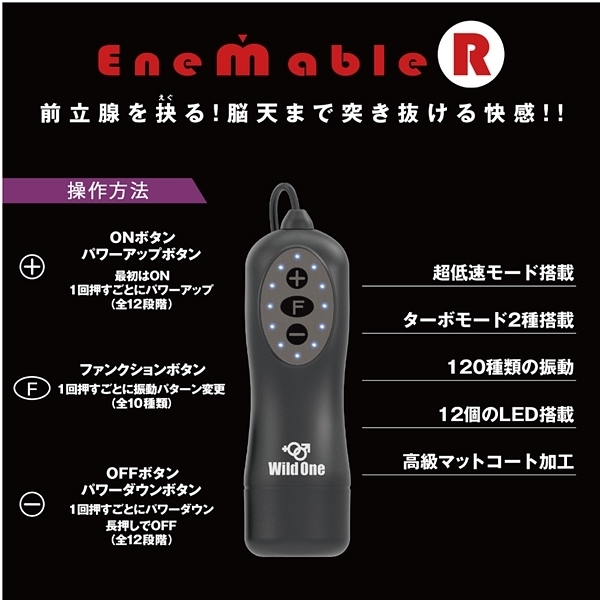 お手軽さが人気の前立腺開発グッズ「エネマブルR」に上級者タイプが新登場!3段階に可動するアームが自由自在に会陰部を刺激する♪12段階の強弱と10種類の振動パターンによる120種類の振動が前立腺をえぐる!初心者から上級者にまで愛される洗練されたフォルムが前立腺を的確に刺激しながら悶絶のドライオーガズムへと誘います。全体的に太さもあり、挿入時の圧迫感も同時に楽しめる逸品♪3段階に可動するフックで会陰部への刺激も自由自在にお楽しみ頂けます!