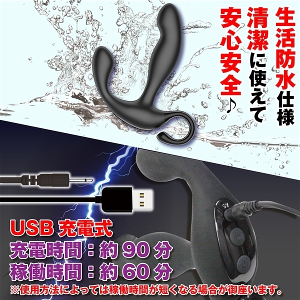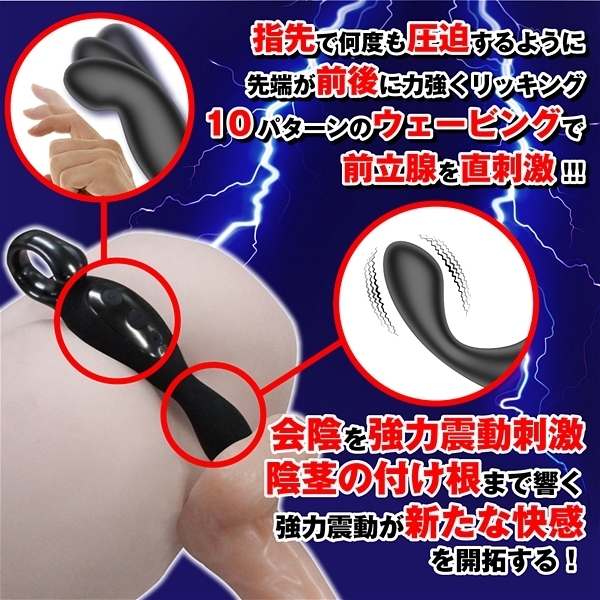 連続絶頂の快感がここに!先端が前後にムーブして前立腺を刺激する強力ウェービング機能が特徴♪ピンポイントに前立腺を狙い撃ちし、高性能な強力震動ローターが会陰を同時刺激することでオスイキ絶頂を誘発!先端がクイっと曲がるので指先の動きにも似たアクションで幅広い刺激を体感♪10パターンのウェービングとバイブレーションは独立操作が可能で付属のリモコンによる遠隔操作も可能!色々な体位で楽しめてナカとソトから快感を味わえます♪電源はUSB充電式でフル充電90分で連続稼働約60分!生活防水仕様なので丸洗いができ衛生的です♪