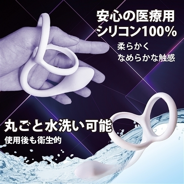 前立腺刺激と会陰部の圧迫、ペニスの締め付けで射精感UP!根本と玉袋の2つを締め付け射精感UP!根本、睾丸、前立腺の3か所を同時に刺激!100%医療用シリコン素材。