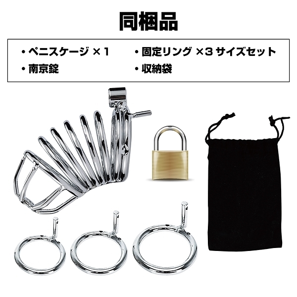 パッケージ:28.0×18.5cm 本体:ペニスゲージ11.2×3.5cm・固定リング小(内径4.0cm)・固定リング中(内径4.5cm)・固定リング大(内径5.0cm) セット内容:ペニスゲージ、固定リング3サイズセット、南京錠、収納袋