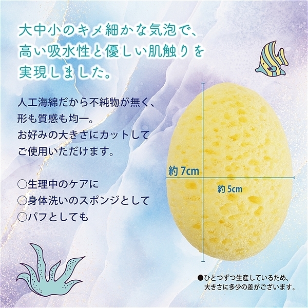 天然海綿を模して成型した、吸水性の高い人工海綿です。風俗店様でお求めやすい、個包装のお得なおまとめ10個パックをご用意いたしました。大きさは大粒で、形も均一なのが特徴です。大中小の不揃いの気泡を作ることで吸水性を高め、優しい肌触りに仕上げました。海から採れる天然の海綿と違い、貝殻や海草、微生物などの不純物もなく安心して清潔にお使いいただけます。長さ約7cm、直径5cm。