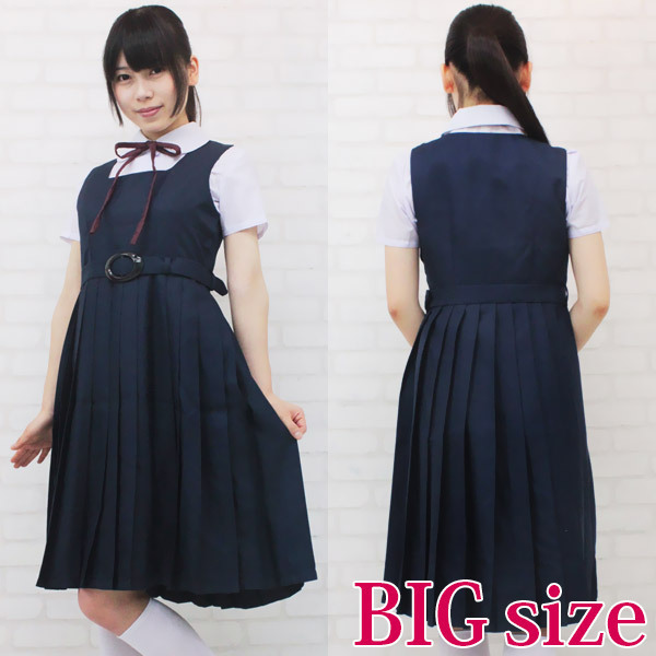 ミドル丈の落ち着いた雰囲気がGOOD!ジャンパースカートタイプの制服コスチューム(BIG)。半袖シャツは愛らしい丸襟!シンプルなリボンとウエストの布製ベルトもポイント!紺色ワンピースは、肩ボタンとサイドのボタンで着脱できます。※水洗い不可、塩素系漂白剤による漂白不可、アイロンは中温で当て布使用、ドライクリーニング可、色落ちの可能性があります。※こちらの商品は在庫の状況によりお届けまでに4日〜7日程度かかる場合がございます。