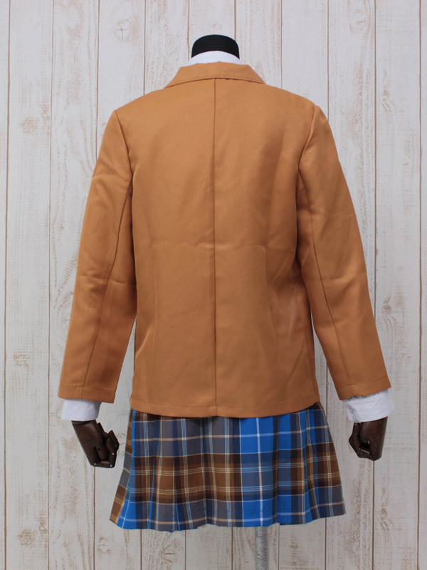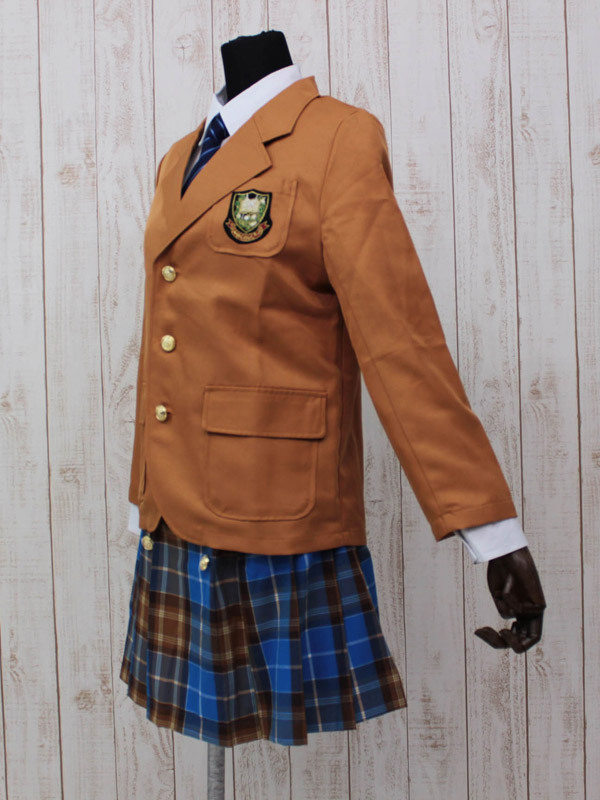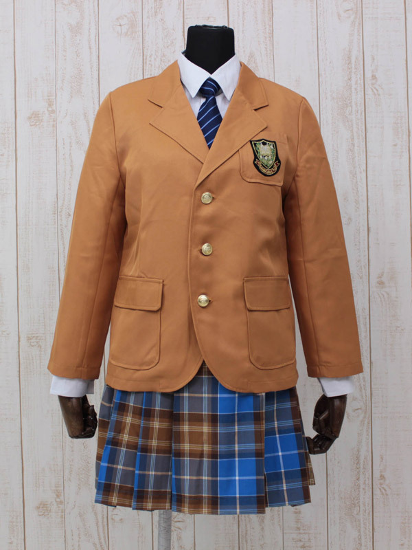 キャメル色ブレザーと青チェックスカートがクラシカルな冬服タイプの制服コスチューム。●刺繍ワッペン付きブレザー●ボタンをあしらったチェック柄プリーツスカート●パリッと着こなしたい長袖白シャツ●長さ調節可能な簡易ネクタイ。憧れのキャメル色ブレザーで学園ドラマのヒロイン気分が味わえちゃう制服コスプレセットです。※水洗い不可、塩素系漂白剤による漂白不可、アイロンは中温で当て布使用、ドライクリーニング可、色落ちの可能性がありますのでご注意ください。※こちらの商品は在庫の状況によりお届けまでに4日〜7日程度かかる場合がございます。