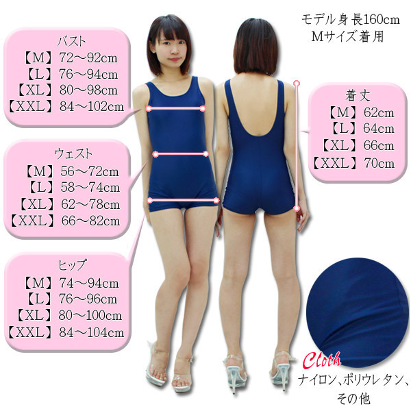 XLサイズ:B80〜98cm・W62〜78cm・H80〜100cm 着丈66cm セット内容:水着単品(前身頃全面に裏地付き、胸部にパット付き) 素材:ナイロン、ポリウレタン、その他