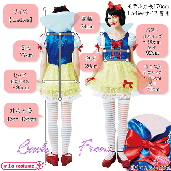Ladiesサイズ:B92cm・W72cm・H〜96cm・身長155〜165cm・着丈77cm・肩幅34cm・袖丈20cm セット内容:カチューシャ、ワンピース(背面ファスナー、スカート部分に裏地あり) 素材:ポリエステル100%