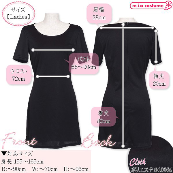 対応サイズ:身長155〜165cm・B〜90cm・W〜70cm・H〜96cm 実寸:B88〜90cm・W72cm・肩幅38cm・袖丈20cm・着丈80cm セット内容:ワンピース単品(背中心ファスナー) 素材:ポリエステル100% モデル身長155cm