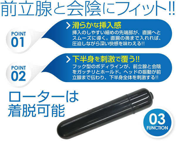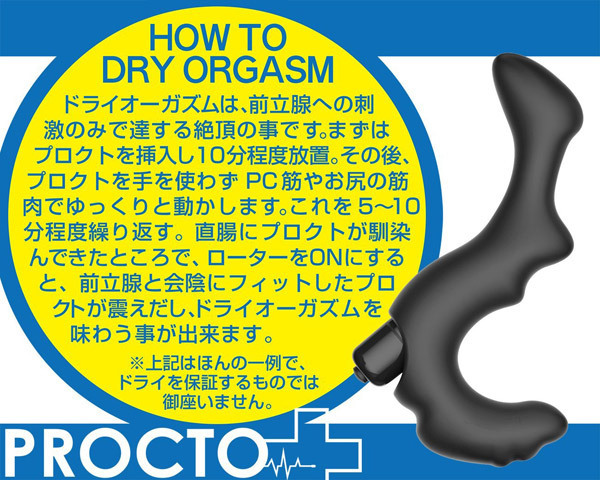 いびつなカタチがポイント!前立腺&会陰部にフィットして極上のドライオーガズムへと導く、新世代型アナルグッズ「プロクト(フィット)」です。●細めの先端がスムーズな挿入をサポート●フック型のボディラインが敏感部分をくまなく刺激●ローター(着脱可能)は操作が簡単なボタンスイッチ●単四電池×1本使用。使用方法の一例:挿入したまま10分放置→PC筋やお尻の筋肉のみで動かす→馴染んできたらローターのスイッチをON!直腸の奥深くまで入り込み、快感ポイントを容赦なく刺激します。今まで感じたことのない新しい快楽の世界を体験できる電動エネマグラです。※電池周りの保護用シートは外さないでください。