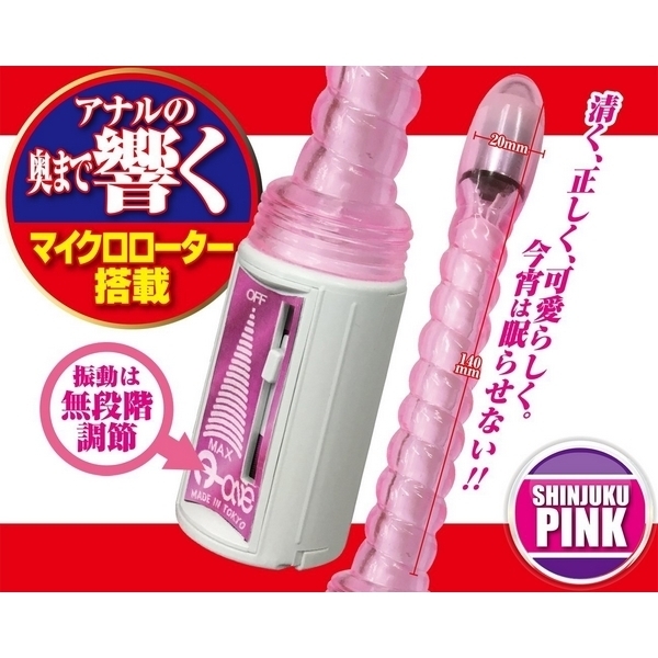 アナルトーキョーからシリアナ快感を世界へ!奥まで響くマイクロローターを搭載したスティック型アナルバイブ。●新宿ピンクカラータイプ●フレキシブルな柔軟ボディ●ポコポコ刺激のスクリュー型●挿入部約14cm、最大径約2cm●先端にマイクロローター搭載●奥まで届くパワフルな振動●振動調整は無段階スライド式●安心安全な日本製グッズ。ぷっくりヘッドにパワフルモーターを搭載した、スリムなスティックフォルムの電動アナルグッズです。