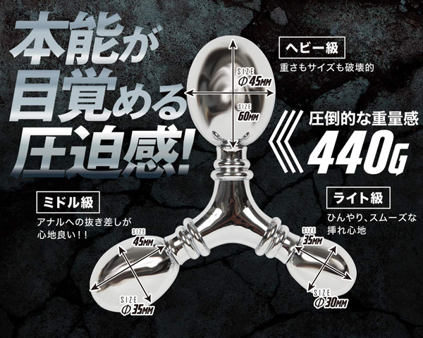 圧倒的な重量感とひんやりとした挿入感が楽しめるアルミニウム合金製のヘビー級アナルプラグシリーズ。トリプルタイプは、3つのヘッドが特徴的。段階的に拡張可能で一番小さい玉から始め徐々に拡張をすれば最終的には怪物級の圧迫感が楽しめる。また、ヘッド部分が三方向に分かれているので3Pプレイでの使用も可能…ヘッド部分は取り外し可能でお手入れも簡単。あなたの本能がいま目覚める!