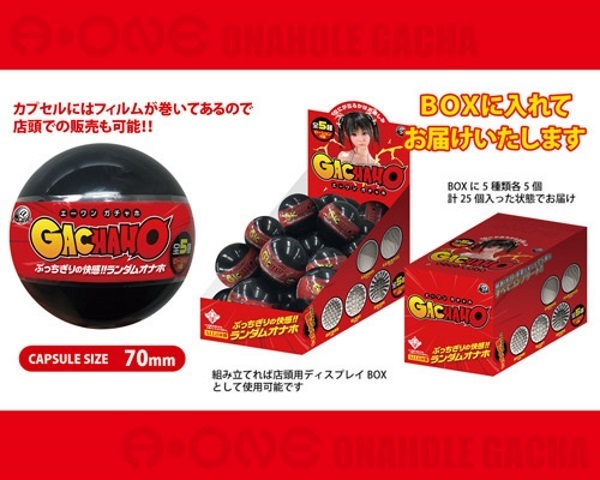 ぶっちぎりの快感!!カプセルにオナホが入ったガチャホール。刺激・形状・重量の異なる全5種類で登場!!【キャノン】スタンダードなねじ切りタイプ。細かいヒダヒダが竿を刺激【カミカゼ】いくつもの細かな凹凸をトルネード上に配置【メテオ】無数のイボ突起が、流星の如く襲い掛かる【ブラスト】ウェーブ状に配置された突起が、カリ首を咥え込む。【スパーク】ヒゲ状の突起がくすぐりながら弾けて刺激。ディスプレイ用としても使用可能なBOXに5種×5個の計25個入った状態で発送いたします。ガチャマシーンに入れて販売することも可能ですが、カプセルにはバーコード付きフィルムが巻かれているので店頭での販売も可能です。