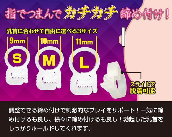 指でつまんでカチカチ締め付け!調整できる締め付けが刺激的なプレイをサポート。一気に締めるも良し、徐々に締めるも良し。勃起した乳首をしっかりホールドしてくれます。男女兼用で乳首に合わせて自由に選べる3サイズ6個入り。