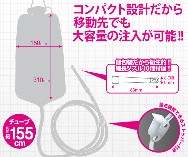 人気医療系グッズの「メディシリーズ」から、家でも外でも手軽にお尻を洗浄できる大容量1200mlサイズのエネマバッグ。高さ31cm、幅15cm、使用後は丸めて運べるコンパクト設計!個包装のゼリー付き細長ノズル10個が付いていて衛生的、さらに155cmのロングチューブまでセットとなっています。蓋を開けてぬるま湯を入れ、フックを高い所で吊り下げお使いください