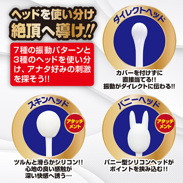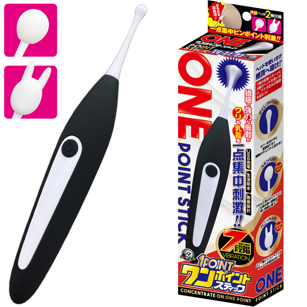 クリや乳首にも♪使い勝手バツグンのピンポイントローター「ワンポイントスティック」です。アタッチメントが2種類付属していてクリや乳首などのピンポイント刺激に威力を発揮!生活防水だからメンテナンスも簡単で極小ヘッドが気持ちいいところを集中して刺激してくれます♪7段階の強力振動とアタッチメントヘッドはカバーを付けずに直接当てたり色々と楽しめます!カバーを付けずに直接当てて気持ちいいダイレクトヘッド、ツルんと滑らかシリコンのスキンヘッド、ポイントを挟み込むバニー型シリコンヘッドと用途にあわせて好みの刺激を使い分けよう♪USB充電式で約120分の充電で連続使用時間は約45分。振動数は7段階、生活防水設計で静音設計。強弱3段階で幅広くお楽しみ頂けます♪