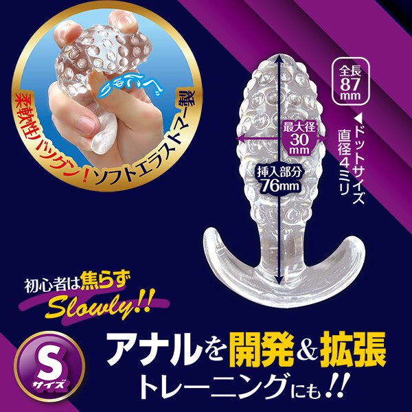 表面には無数のドットイボが配置されたアナルも悦ぶ「エネマソフトドッツS」です♪挿入部分の無数のドットがアナルにフィット!アナルの開発&拡張に最適なプラグで挿れやすくて抜けにくい設計♪これさえあればアナルプレイが存分に楽しめる!ソフトエラストマー製だから柔軟性も抜群で、丸洗いもできて何度も使用OK♪使いやすいストッパー付きで安心してプレイできます!見た目も美しいクリアタイプのアナルプラグで初心者向き♪まずはこれから挿れてみよう!